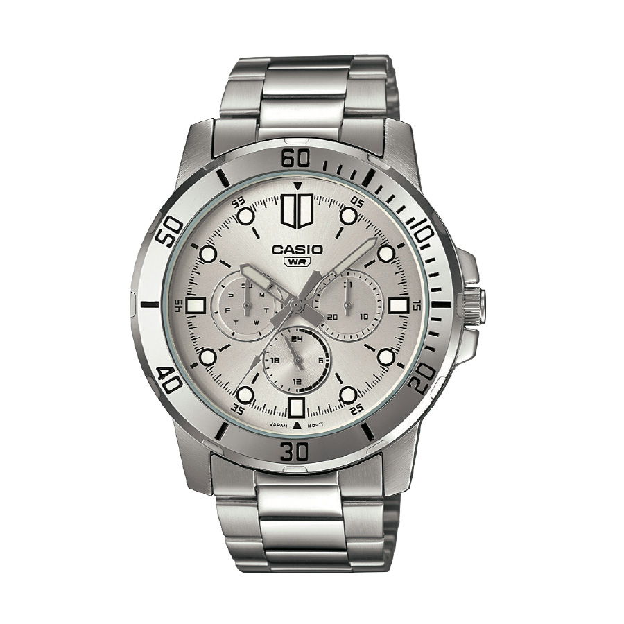 The Casio MTP-VD300D-7EUDF is a standard men’s analog watch from the Casio Enticer collection, known for its blend of classic style and practical functionality. It features a silver or white dial with three sub-dials for day, date, and 24-hour time. The watch is housed in a stainless steel case with a matching stainless steel band.