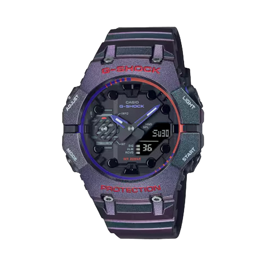 The Casio GA-B001AH-6ADR is a men’s analog-digital watch from the G-SHOCK “Aim High” Series. The watch’s design is inspired by futuristic, virtual worlds and features a vibrant purple and black color scheme with contrasting metallic accents. It also includes Bluetooth connectivity for enhanced functionality with a smartphone.