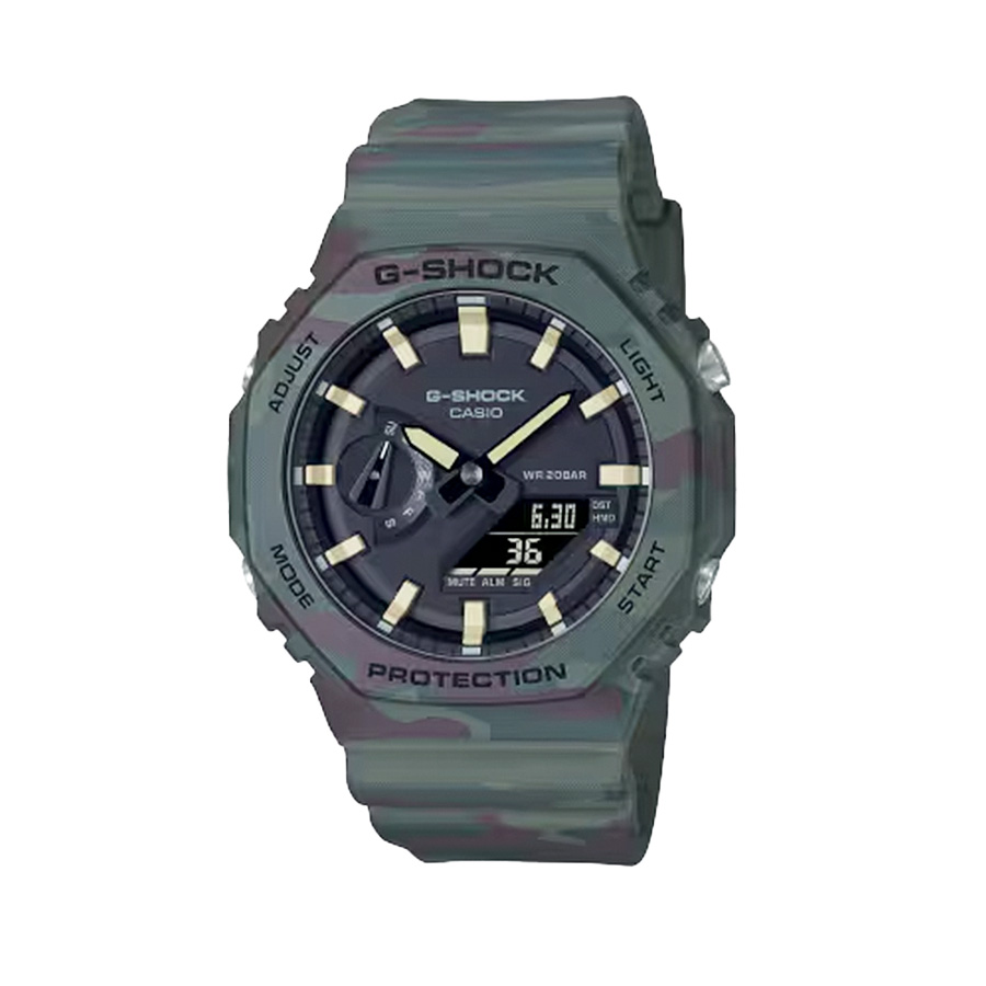 The Casio G-Shock GAE-2100WE-3ADR is a custom box set that includes interchangeable bezels and bands, allowing for a versatile and stylish look. It features a green camouflage resin band and bezel, a black dial, and a second, interchangeable band and bezel in solid orange and black.