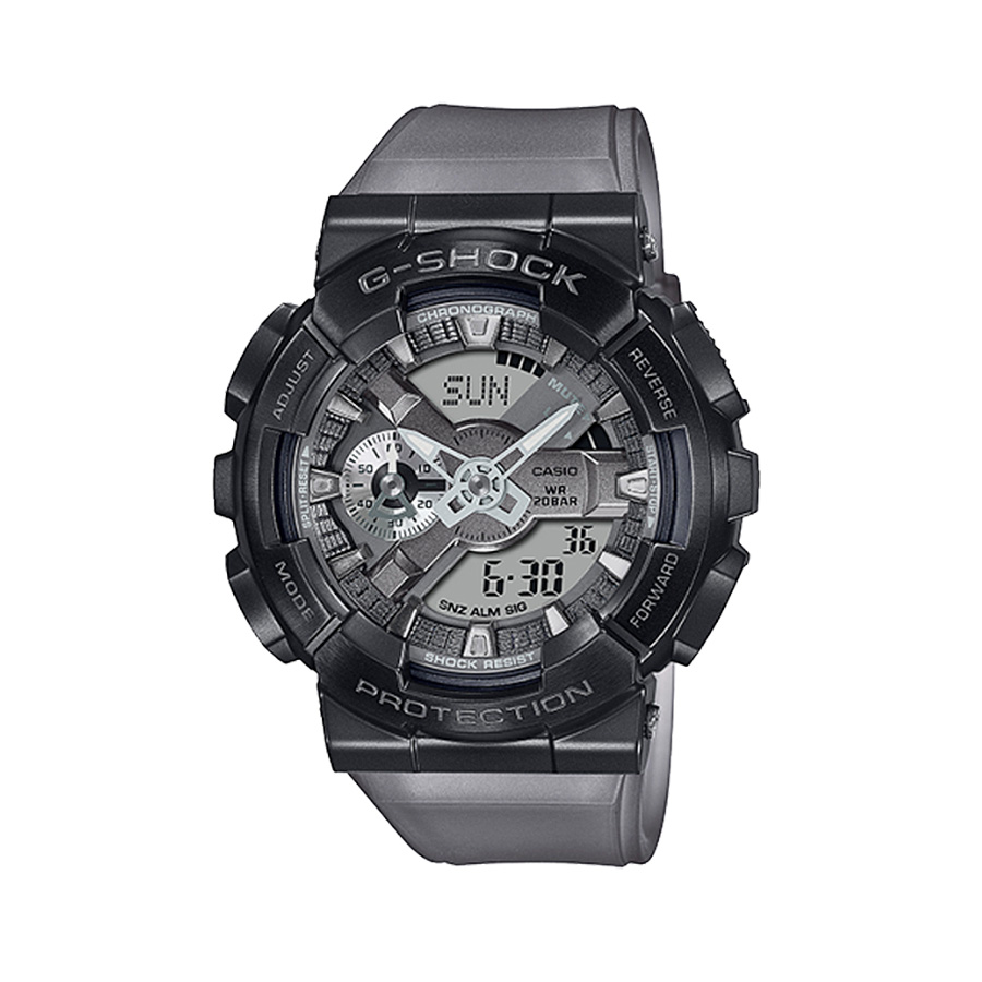 The Casio G-Shock GM-110MF-1ADR is a men’s black and gray analog-digital watch from the “Metal Covered Midnight Fog” series. It combines the signature G-Shock durability with a sleek, polished metallic appearance, inspired by the ethereal look of night fog. The watch features a dark ion-plated stainless steel bezel, a gray dial, and a semi-translucent black resin band.